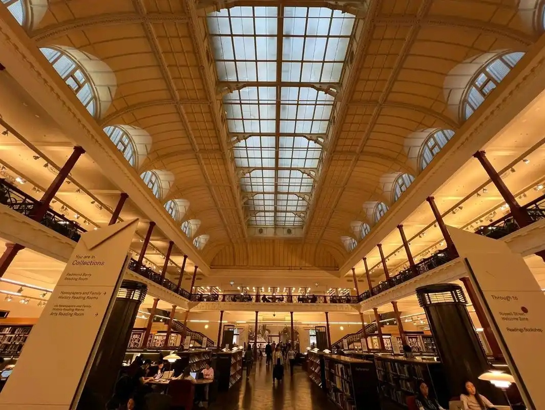 在澳大利亚墨尔本市中心斯旺斯顿街的核心地段,矗立着一座兼具古典美学与人文温度的建筑 —— 维多利亚州州立图书馆(State Library Victoria)。作为澳大利亚历史最悠久的公共图书馆,也是全球最早推行免费开放的图书馆之一,它历经近 170 年岁月洗礼,早已超越普通图书馆的范畴,成为维多利亚州的文化地标、知识宝库与城市精神的承载者,见证着墨尔本从殖民小城到世界文化名城的蜕变。
