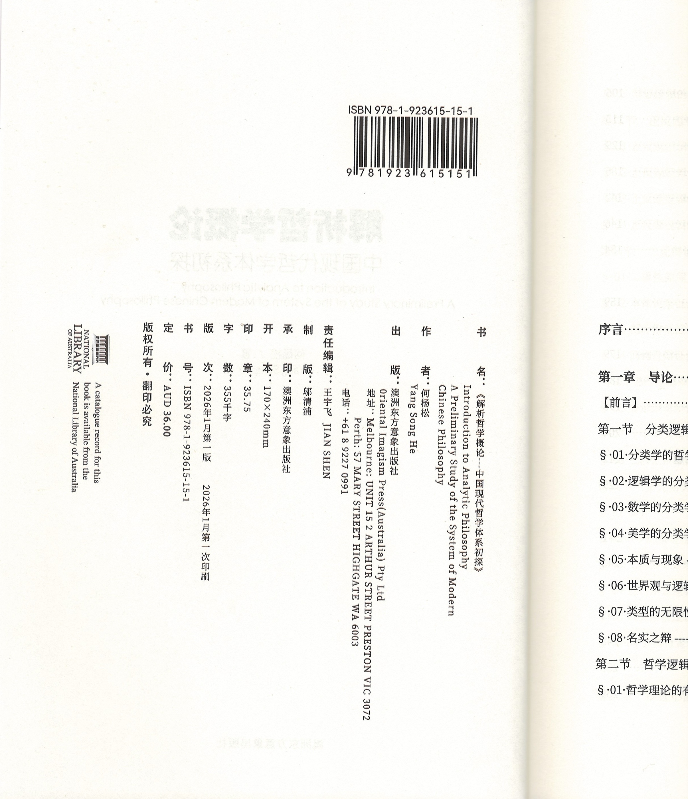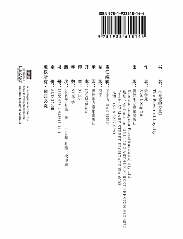 近日,澳洲东方意象出版社(OIPA)出版的两部作品——何杨松《解析哲学概论——中国现代哲学体系初探》、余学龙长篇反腐小说《忠诚的力量》,被澳大利亚国家图书馆(NLA)永久馆藏。这是继《英脉华章》后,我社中文图书再度入选澳洲国家级馆藏,彰显中国原创作品的国际影响力。